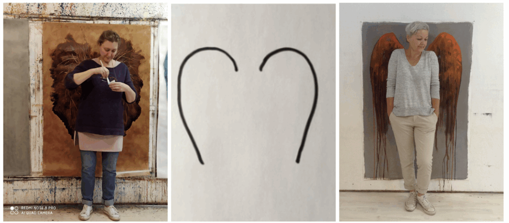 Et puis, comme je n’avais rien anticipé et rien chercher à contrôler, mes deux arcs de cercle ont coulé vers le bas du mur et, à ma grande surprise, des ailes sont apparues.