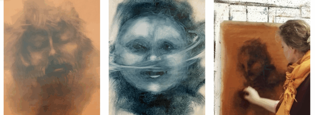 Ils sont arrivés accidentellement dans mon travail, il y a plus de 20 ans. Ces visages sont apparus dans ma couche picturale alors que je tentais d’organiser une composition avec un chiffon. Nous faisons connaissance à mesure que mon chiffon les révèle. L’Essuyage est un acte amoureux et un peu magique.