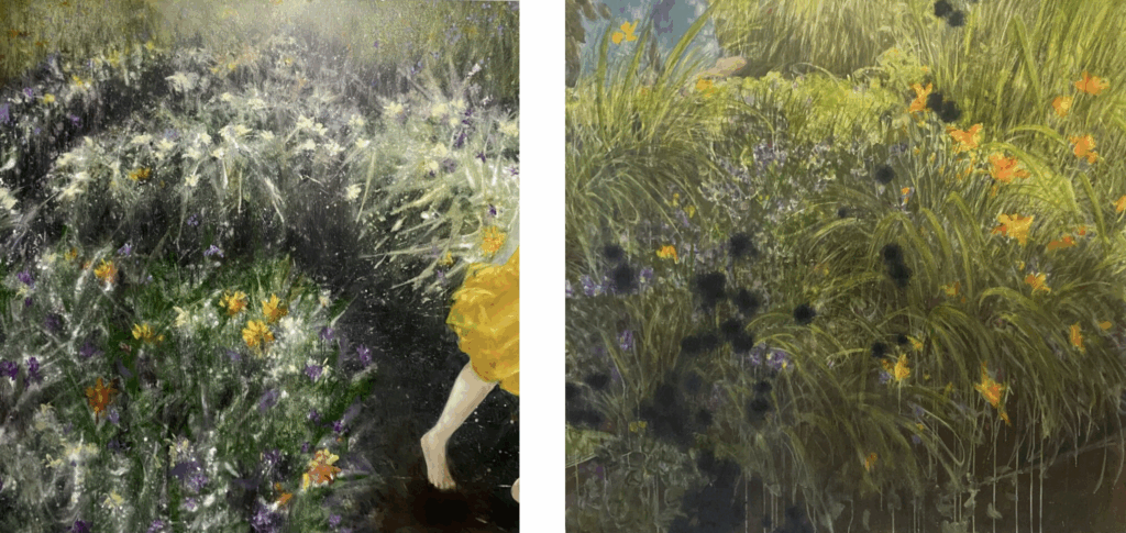 Il y a eu en 2008, une première exposition à la Galerie Myriam H. « Un pas de plus » qui présentait déjà ce qui allait devenir une récurrence inconsciente dans mon travail : des personnages dont on ne voit que les pieds, qui traversent la surface picturale (paysages ou autres…).